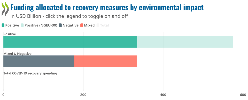 The OECD Green Recovery Database tracks environmentally focused measures in member countries and key partners – most of the G20 countries – and assesses whether they are likely to have positive, negative or mixed impacts across several environmental dimensions, ranging from climate change and biodiversity loss to pollution and waste management.